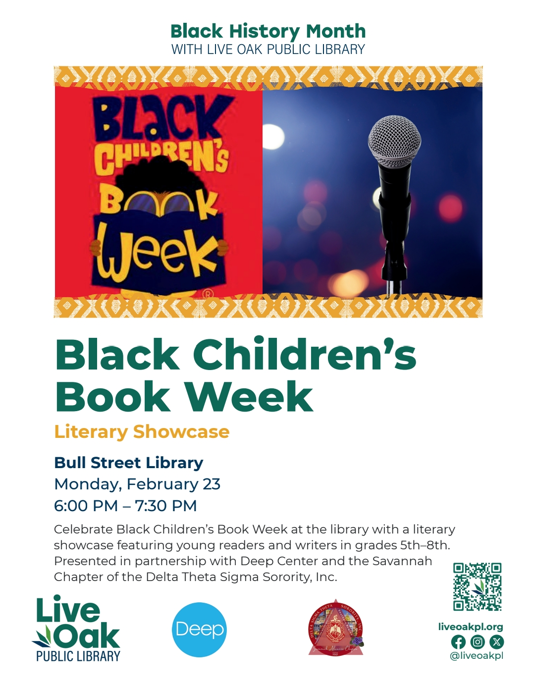 Bull Street Library 2002 Bull St,, SavannahJoin Live Oak Public Library in celebrating Black History Month with a special Black Children’s Book Week Literary Showcase at the Bull Street Library! This inspiring event will feature young readers and writers in grades 5th–8th, highlighting the power of storytelling and youth voices in our community. 📍 Bull Street Library📅 Monday, February 23🕕 6:00 […]